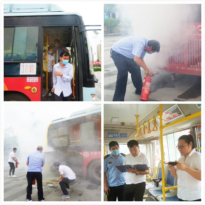 公交車動(dòng)態(tài)安全演練模擬一輛正在行駛中的公交車,駕駛員突然聞到車內(nèi)有異味,發(fā)現(xiàn)車輛尾部發(fā)動(dòng)機(jī)艙在冒煙,駕駛員隨即打開(kāi)緊急雙閃燈,啟動(dòng)車內(nèi)智能監(jiān)控報(bào)警,向公司智能調(diào)度中心報(bào)警,并立即靠邊停車,打開(kāi)前后車門,疏導(dǎo)乘客從前后門有序下車,遠(yuǎn)離車輛。駕駛員在檢查車內(nèi)無(wú)乘客后,下車查看火情,用車上滅火器對(duì)準(zhǔn)著火點(diǎn)底部滅火,同時(shí)撥打火警電話。搶險(xiǎn)救援組得知后緊急奔赴現(xiàn)場(chǎng),開(kāi)展事故應(yīng)急救援,事故處理組帶領(lǐng)人員現(xiàn)場(chǎng)調(diào)查和搜集材料,向公司上報(bào)相關(guān)情況。